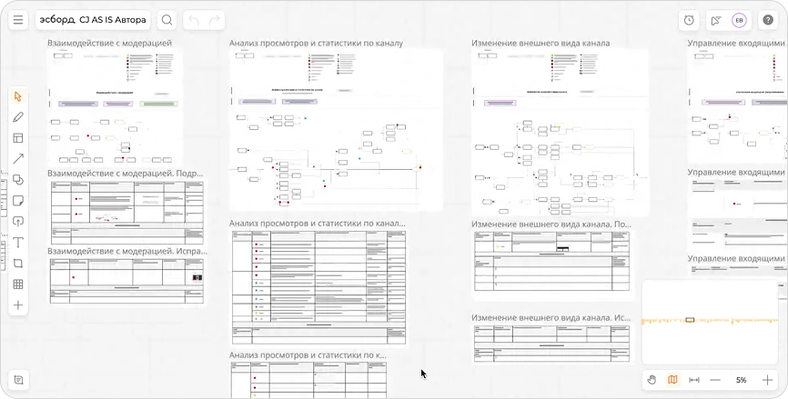 На досках жили CJ, User Flow, Service Blueprint, а также таблицы с юзабилити-проблемами и требованиями к клиентскому опыту.