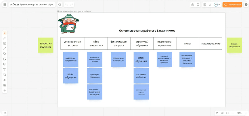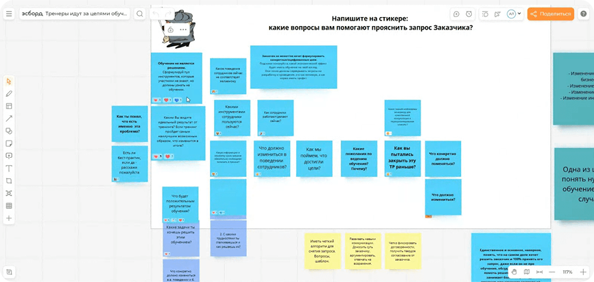 Иногда доски превращаются в полноценные «интерактивные слайды»: участники переходят от блока к блоку, крепят стикеры, ставят эмодзи, а в конце сессии подводят итоги прямо на доске.